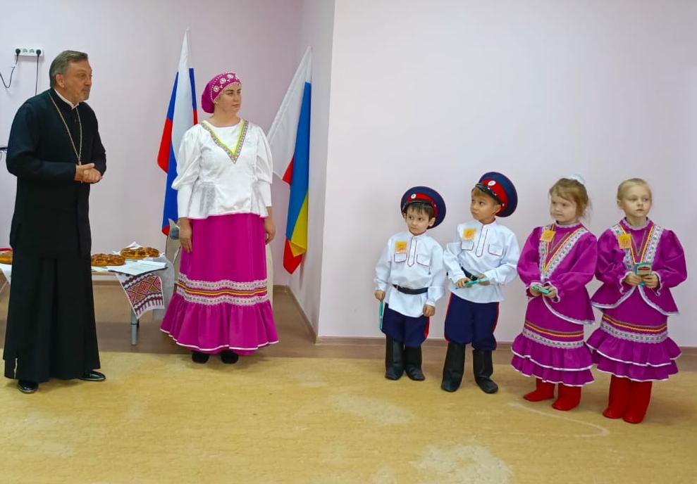 В уютном зале собрались не только сами дети, но и их родители, а также уважаемые гости: священник Семикаракорского храма иконы Божией Матери «Всех скорбящих Радость» Георгий Кузменьков и глава Семикаракорского казачьего общества Владимир Анатольевич Панченко.