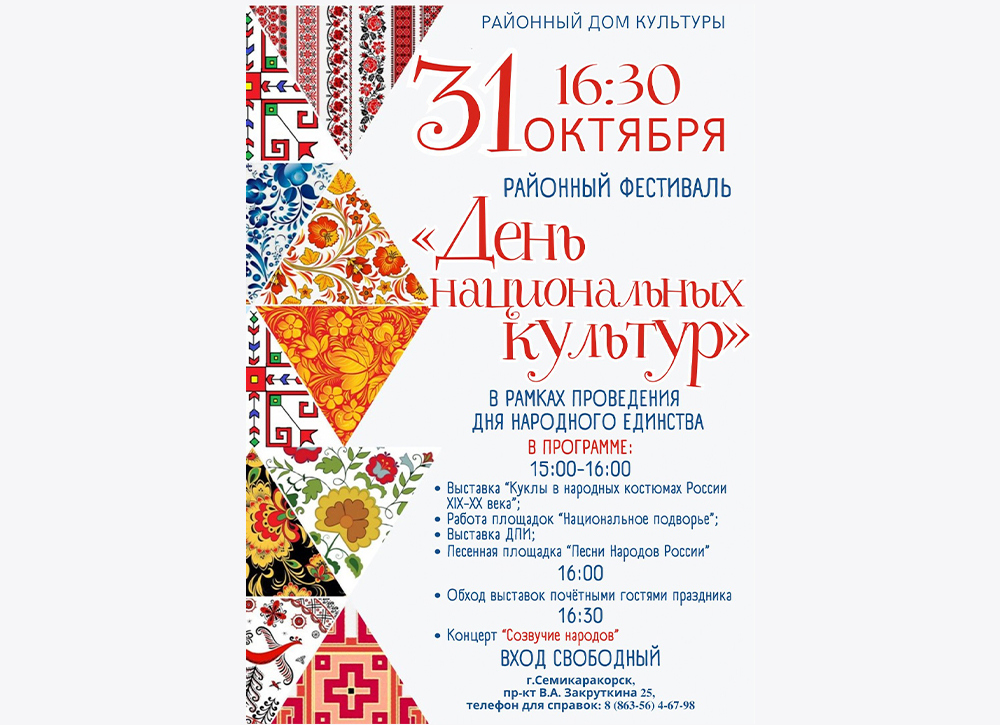 В районном Доме культуры 31 октября состоится фестиваль «День национальных культур», приуроченный ко Дню народного единства. Мероприятие начнется в 16:30.