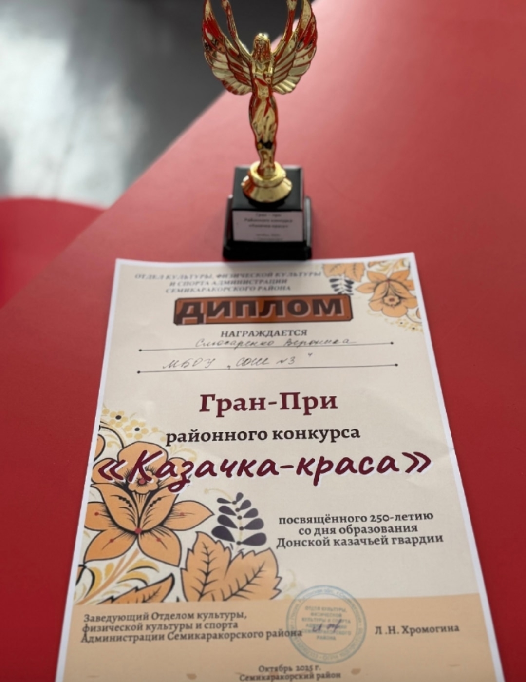 По результатам районного конкурса «Казачка-краса» жюри удостоило победителей дипломами 1, 2 и 3 степени, а Вероника была удостоена гран-при. Главная награда районного конкурса «Казачка-краса» стала заслуженной. Её талант, трудолюбие и преданность традициям донского казачества покорили сердца всех присутствующих.
