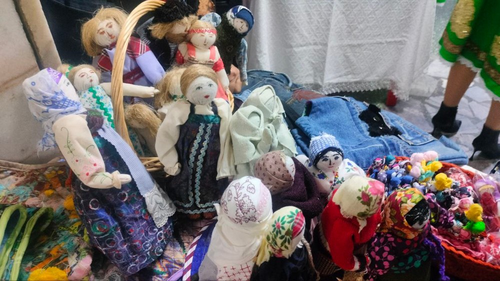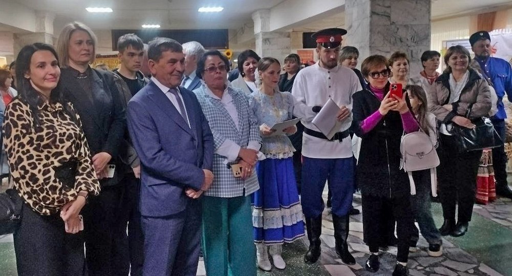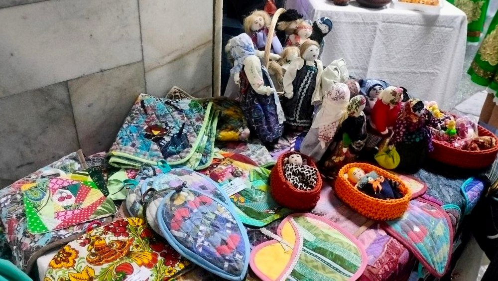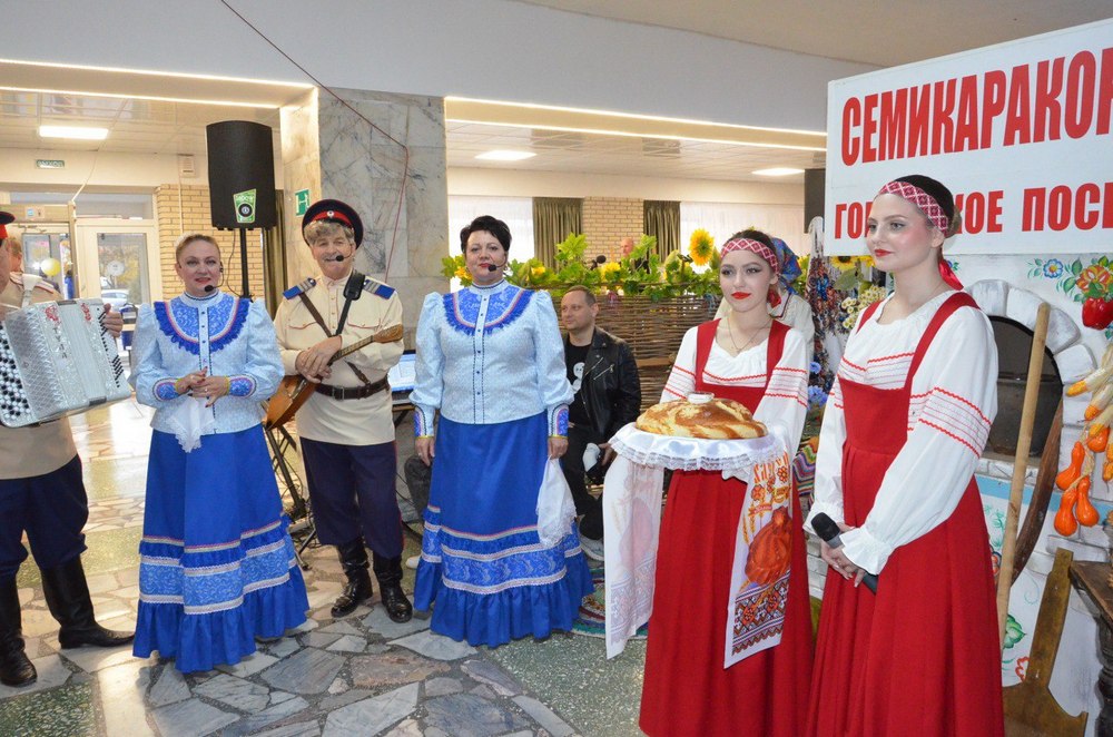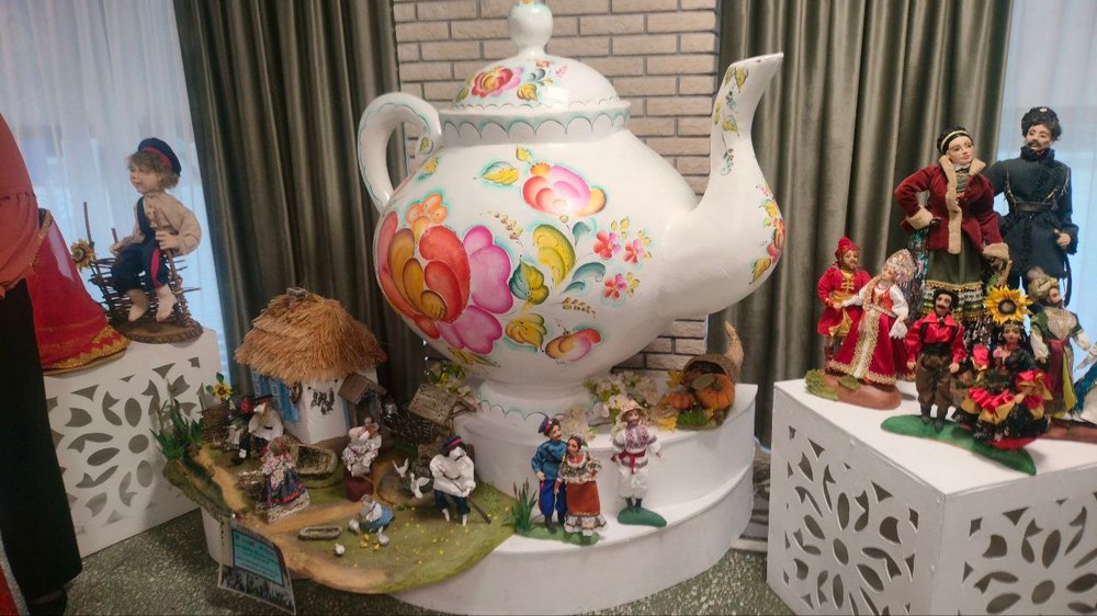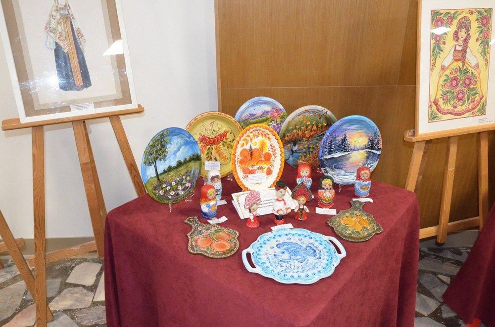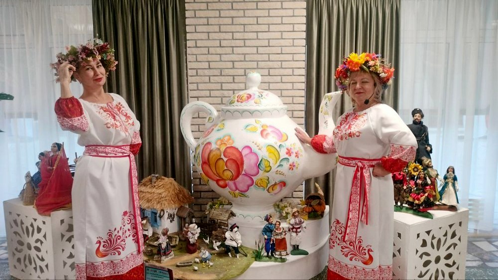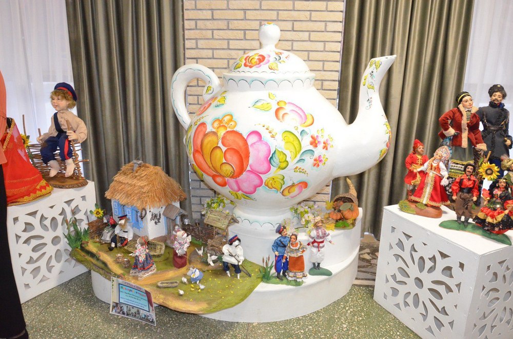 В холле РДК было оживленно, играла музыка, гости мероприятия с интересом знакомились с экспозицией ремесленных изделий и кукол в национальных одеждах. Особенно привлекал внимание большой декоративный чайник, выполненный в стиле Семикаракорской керамики.