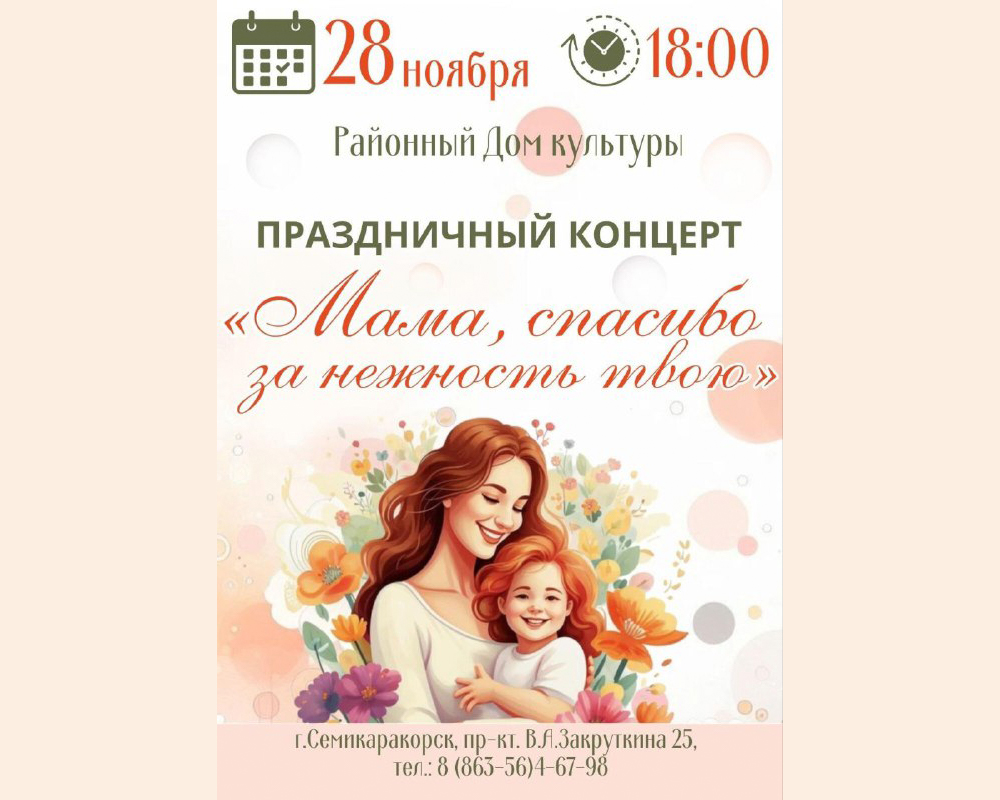 Приглашаем всех! Сегодня вечером, ровно в 18:00, в районном Доме культуры состоится торжественный концерт в честь Дня матери.
