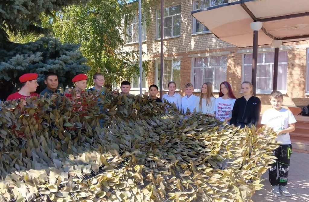 Это заместитель директора по воспитательной работе Надежда Васильевна Слизкова научила классных руководителей, юнармейцев и активистов Движения Первых плести сети, а они потом показали всем ребятам. Более 80-ти девочек и мальчиков с большим желанием включились в изготовление военной маскировки — делают ее на переменах и после уроков для укрытия боевой техники, блиндажей, чтобы защищала от ударов беспилотников и бомбардировщиков. Ребята уверены, что созданные их руками полотна спасли уже не одну солдатскую жизнь. Во время работы оживленно обсуждают героизм участников специальной военной операции, тяжесть их фронтовых будней.