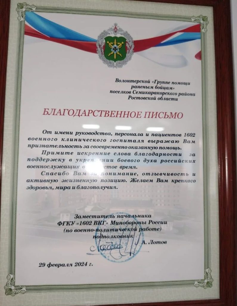 Мы глубоко признательны главе Задоно-Кагальницкого сельского поселения Светлане Савельевне Мыхно — она тоже давно является членом группы «Помощь раненым бойцам» и активно, с открытой душой помогает солдатам.