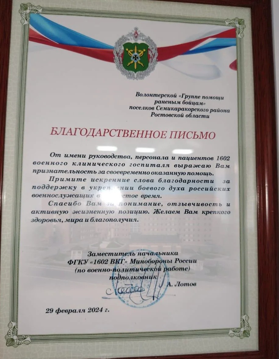 Мы глубоко признательны главе Задоно-Кагальницкого сельского поселения Светлане Савельевне Мыхно — она тоже давно является членом группы «Помощь раненым бойцам» и активно, с открытой душой помогает солдатам.