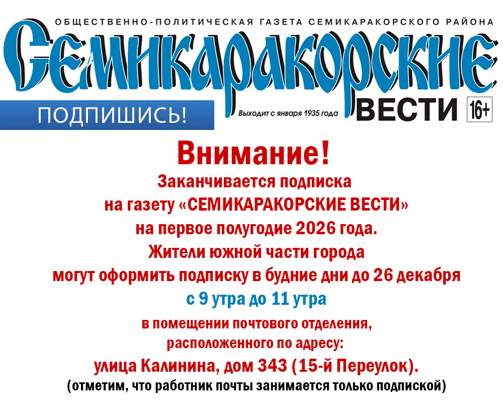 Жители южной части города, желающие оформить подписку на «Семикаракорские вести», смогут это сделать по будням с 9.00 до 11.00 в здании почтового отделения по адресу: ул Калинина, зд. 343 (15-й Переулок).