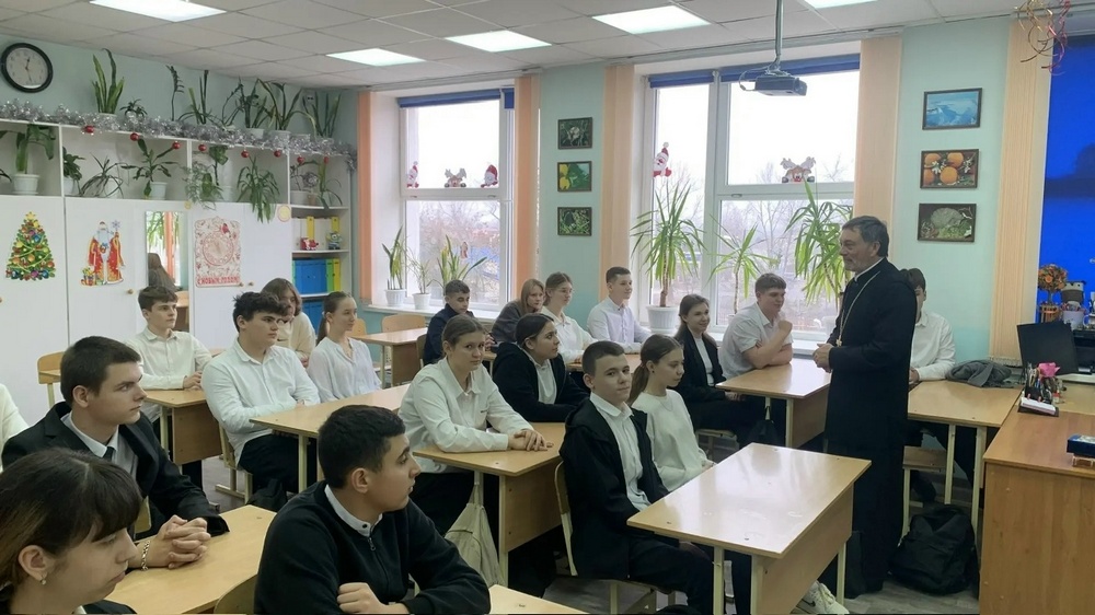 В Семикаракорской школе №1 прошла встреча со священником, отцом Георгием (Кузменьковым). Батюшка провел урок нравственности для подростков. Это был не просто урок, а настоящее увлекательное путешествие в мир православной веры. В форме непринужденного и искреннего разговора были обсуждены темы сострадания и христианских ценностей.