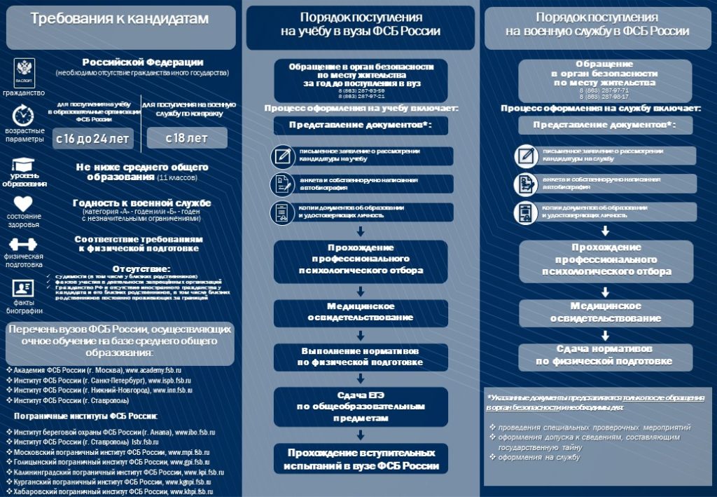 Перечень специальностей и интересующая информация (по вопросам поступления) в образовательные организации ФСБ России доступна на сайте www.fsb.ru.
