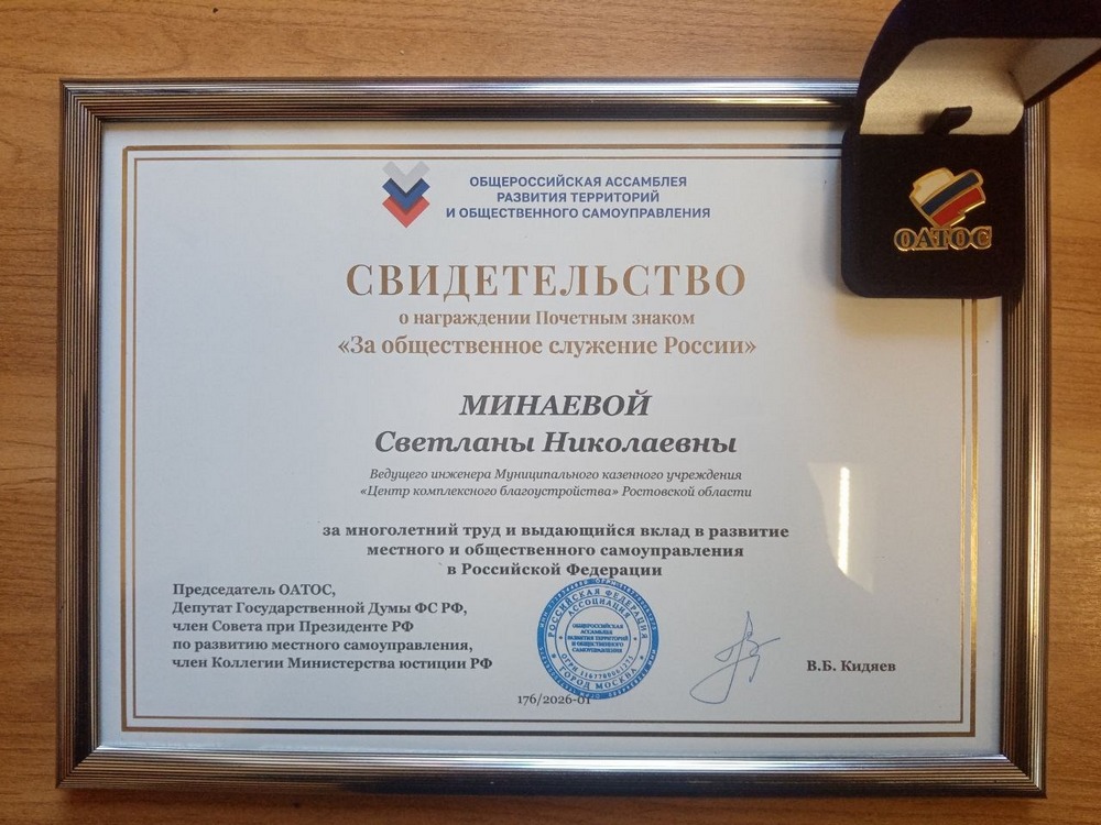 На форуме местного и общественного самоуправления, проходившего в Москве 23 января, наша землячка, ведущий инженер Семикаракорского муниципального казенного учреждения «Центр комплексного благоустройства» С.Н. Минаева награждена Почетным знаком «За общественное служение России».