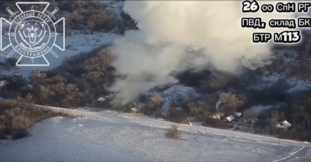 Здесь отряд ВСУ разместился в частном доме, в пристройке сложил свои боеприпасы, а у соседнего дома спрятал под маскировочной сетью американский гусеничный бронетранспортер М113.