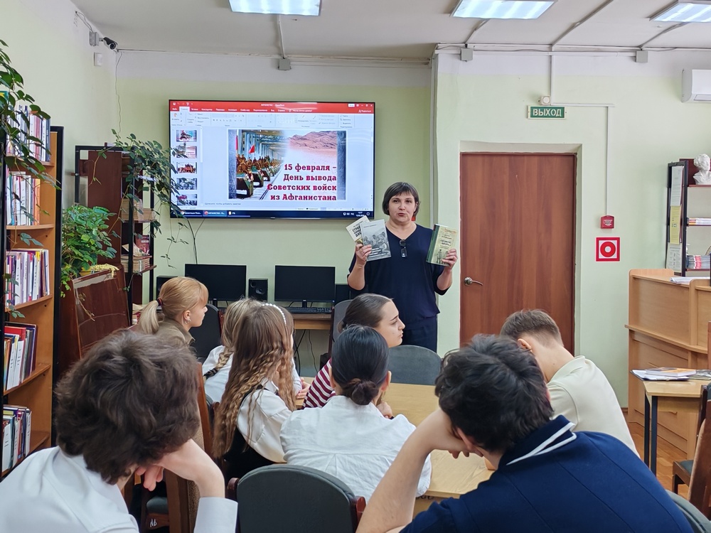 Эта встреча в читальном зале была посвящена дню памяти граждан России, выполнявших служебные задачи за рубежом. Сотрудница отдела обслуживания читателей Юлия Александровна Степанова обратилась к подросткам с информацией о выводе советских войск из Афганистана. Дата 15 февраля 1989 года, по ее словам, объединяет в себе чувства скорби по ушедшим соотечественникам, радости возвращения на родину и увековечения памяти о ратных подвигах наших солдат.