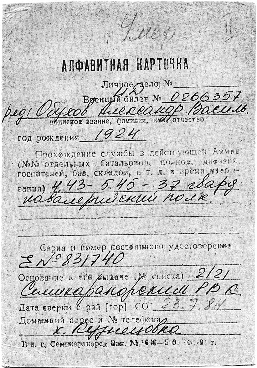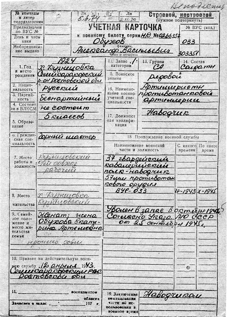 Сергей Тимофеевич на основании документов, имеющихся в Семикаракорском военкомате, рассказал, что Александр Васильевич Обухов служил в 37-м гвардейском казачьем кавалерийском полку в составе 10-й гвардейской кавалерийской дивизии, действовавшей на южном направлении — Кубань, Ростовская область. В феврале 1945 года был ранен в левую ногу. Из учетной карточки к военному билету стало известно не очень много: герой наш — уроженец Кузнецовки, беспартийный, образование — пять классов, перед войной работал в овощесовхозе, был женат на Екатерине Артемовне Обуховой; после войны получил специальность «горный мастер» — скорее всего, в г. Гуково Ростовской области, потому что из той же учетной карточки следует: в ноябре 1966 года Гуковский РВК признал А.В. Обухова «годным к нестроевой службе в военное время». Это одно из направлений поиска материалов о нашем земляке — наверняка такая работа заинтересует учащихся Кузнецовской средней школы. Хорошо бы обратиться в сельскую администрацию хутора — изучить в архиве похозяйственные книги времён Великой Отечественной войны, там обязательно должны найтись сведения об Александре Васильевиче Обухове и его семье!