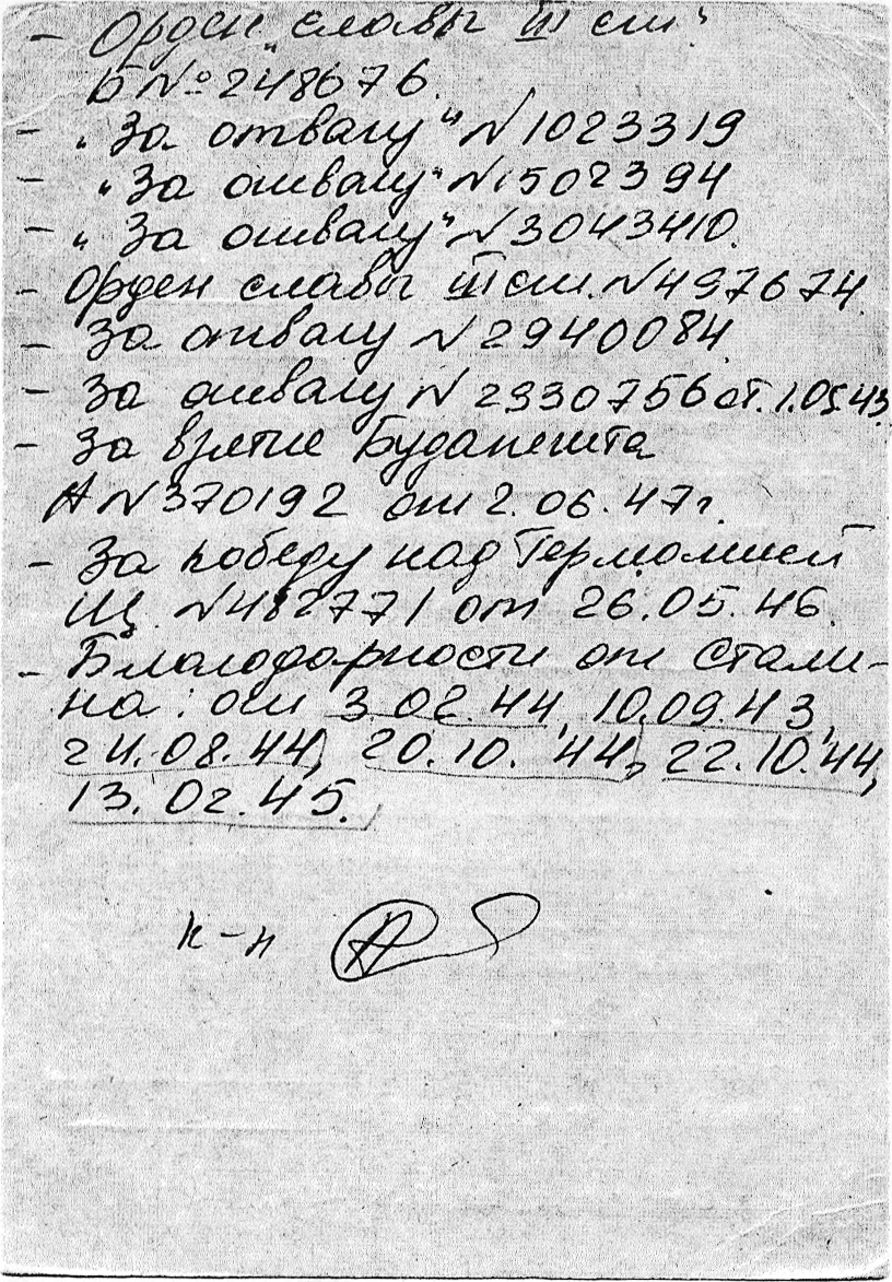 12 апреля 1943 года, получил военную специальность «артиллерист». Из другого документа, об этом скажем позже, явствует, что он был уволен в запас 25 сентября 1945 года. А теперь вчитайтесь в текст письма о наградах молодого бойца А.В. Обухова и обратите внимание на количество медалей «За отвагу» — их пять и на два ордена Славы 3-й степени. Стиль документа сохраняем.