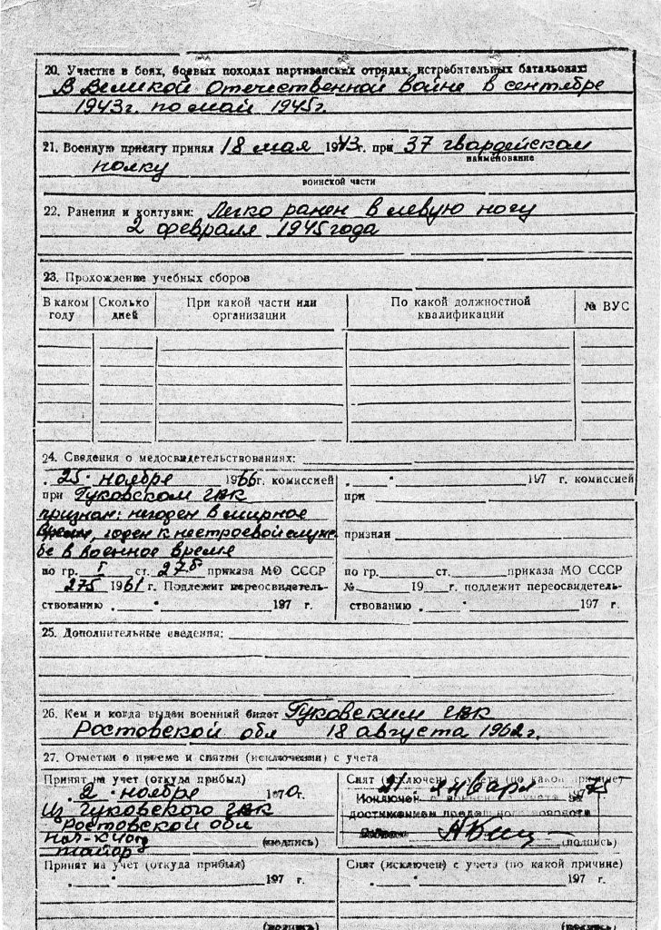 Желая узнать ещё какие-нибудь факты о герое-кузнецовце, безрезультатно обратились в Кузнецовский школьный музей, а потом отправились в Семикаракорский военкомат. Встретились с Сергеем Тимофеевиче Скрынниковым, помощником начальника отделения учёта мобилизационных ресурсов, майором в отставке, 22 года отдавшем армии. Он защищал интересы СССР в группе Советских войск в Германии — ещё молодым, по призыву, а потом, после окончания военного строительного училища, — в Монголии и Казахстане.