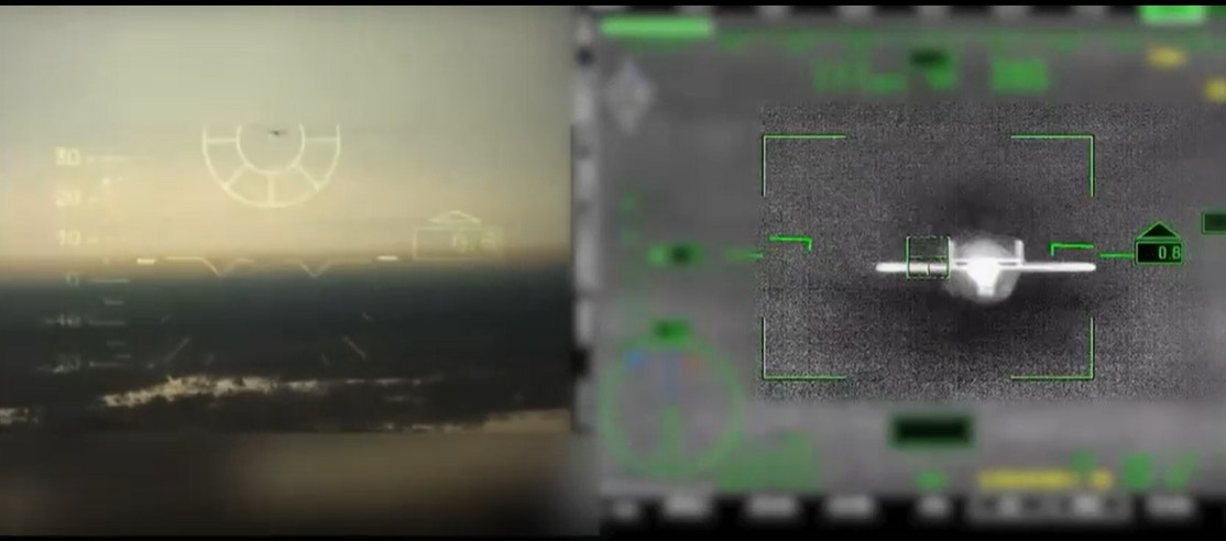 Охота на БПЛА показана из кабины и через прицел. Начинается ролик перехватом беспилотного самолета прямо по курсу — дрон взрывается в сотне метров перед летчиками.