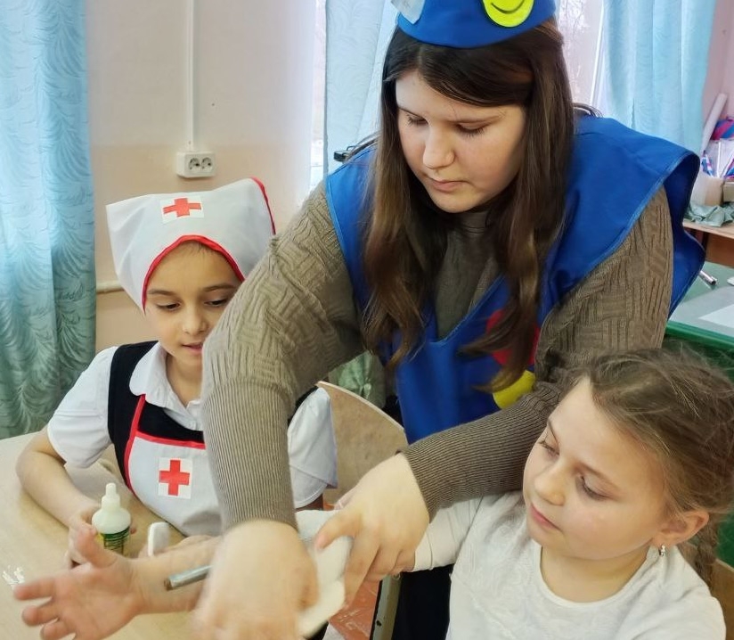 Старшеклассница Ксения Токарева, чья мечта – стать медсестрой, наглядно продемонстрировала юным участникам, как обрабатывать мелкие раны и как правильно накладывать повязки на травмированную кожу.