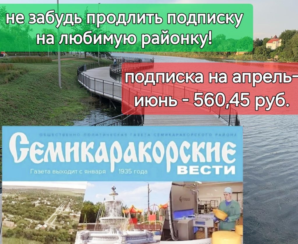 Цена на районную газету «Семикаракорские вести» на три месяца — апрель-июнь — составит 560 рублей 45 копеек.
