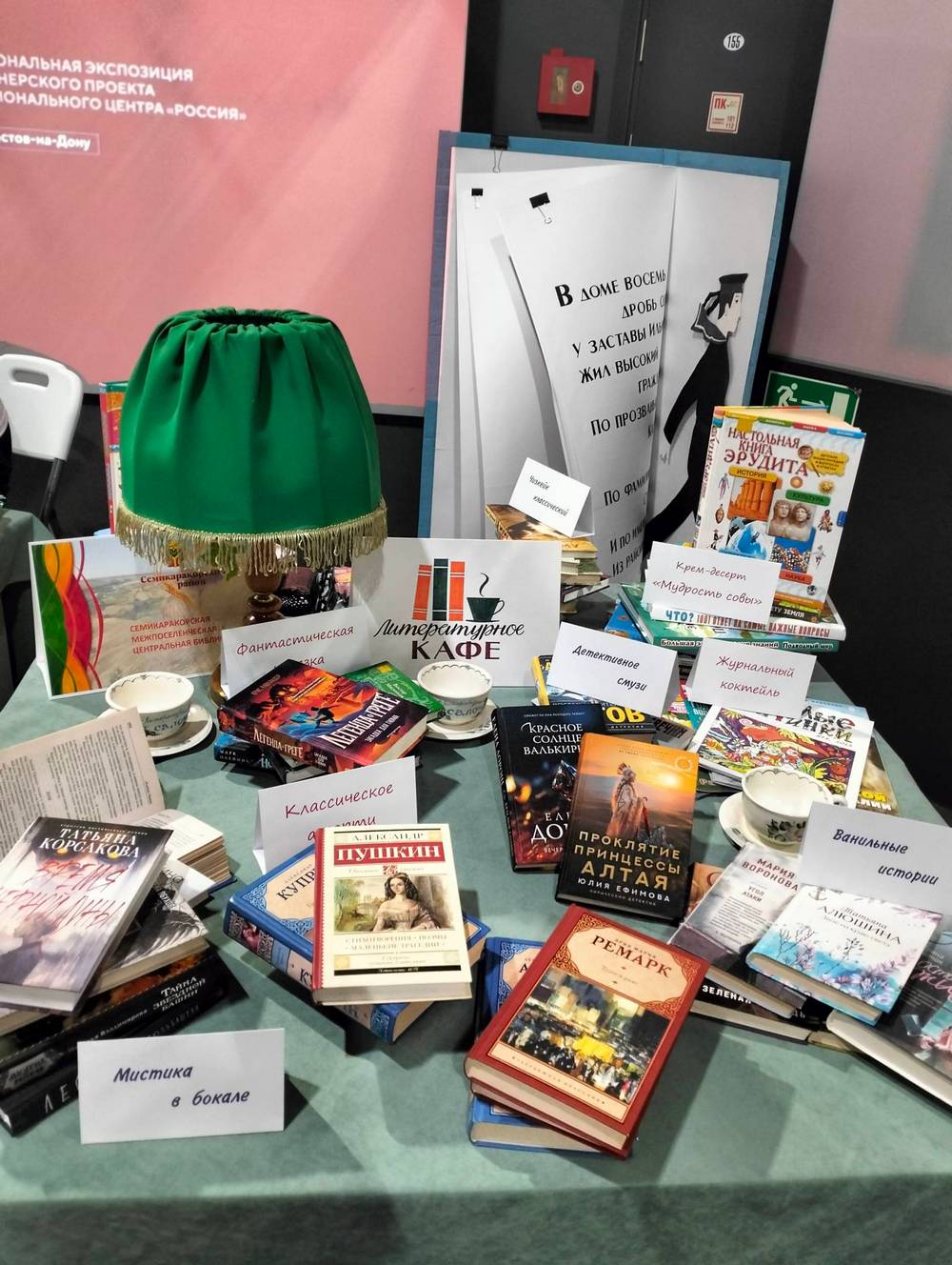 Семикаракорский район на выставке кроме прочих представляла и межпоселенческая центральная библиотека. Сотрудники подготовили книжную экспозицию, посвященную творчеству местных авторов. Кроме того, всех желающих приглашали в «Литературное кафе». Под зеленым абажуром лампы посетителям предлагались тематические напитки и закуски, стилизованные под литературные произведения: «классический пунш», «детективное смузи», «ванильные истории», «фантастическая нарезка», «журнальный коктейль» и другие.