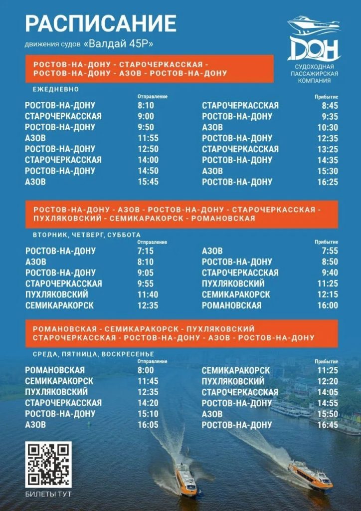 - Теплоход «Валдай 45Р» будет ежедневно совершать рейсы из Ростова-на-Дону в Старочеркасскую и Азов, а также обратно, обеспечивая регулярное сообщение.